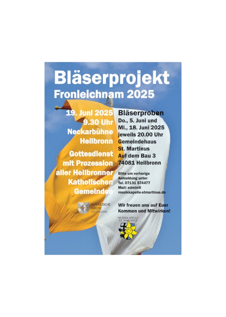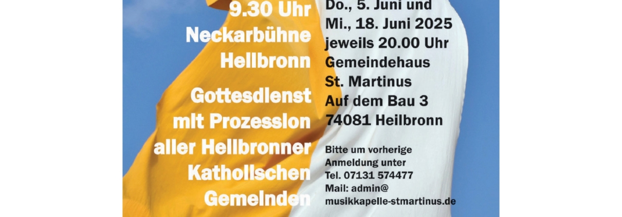Proben für Fronleichnam:Donnerstag, 5. Juni und Mittwoch, 18. Juni jeweils um 20.00 Uhr im Gemeindehaus St. Martinus, Auf dem Bau 3, 74081 Heilbronn-Sontheim.